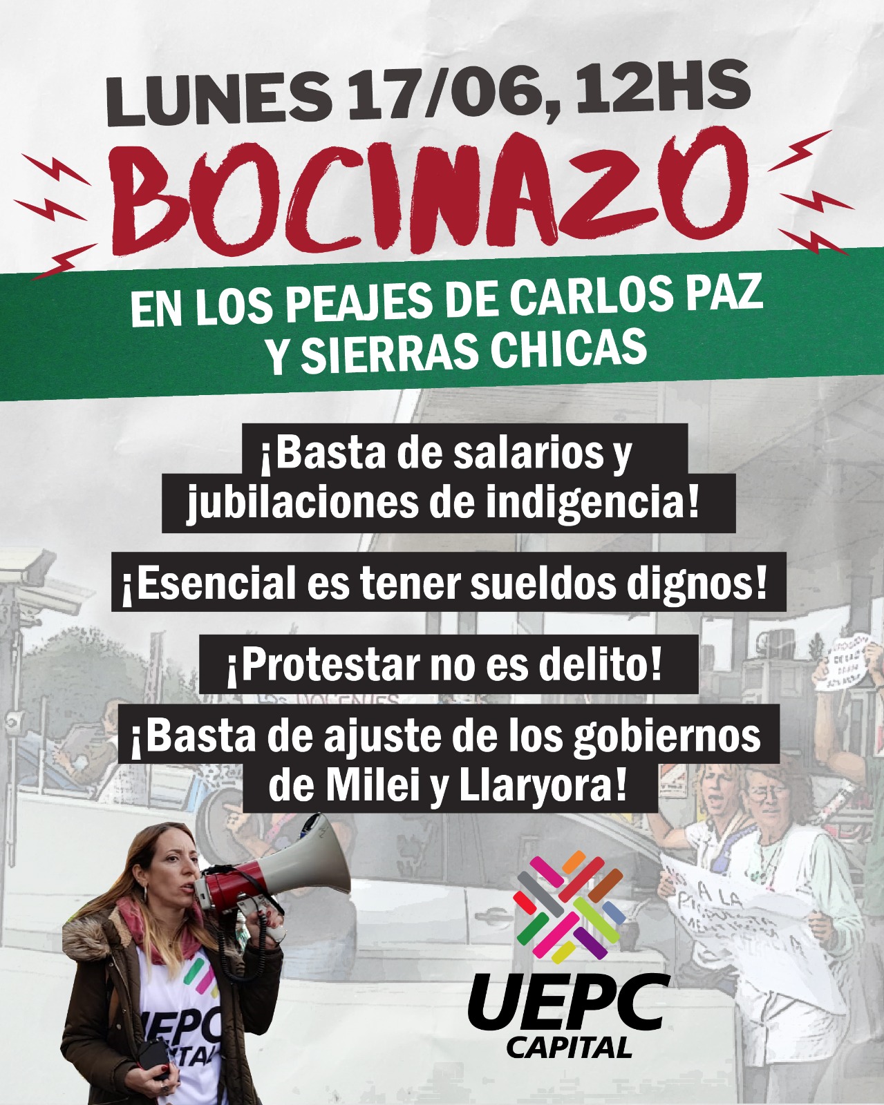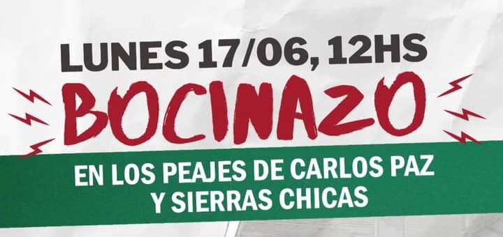 Este lunes 17/06 nos convocamos en los peajes de Carlos Paz y Sierras Chicas a las 12hs.
