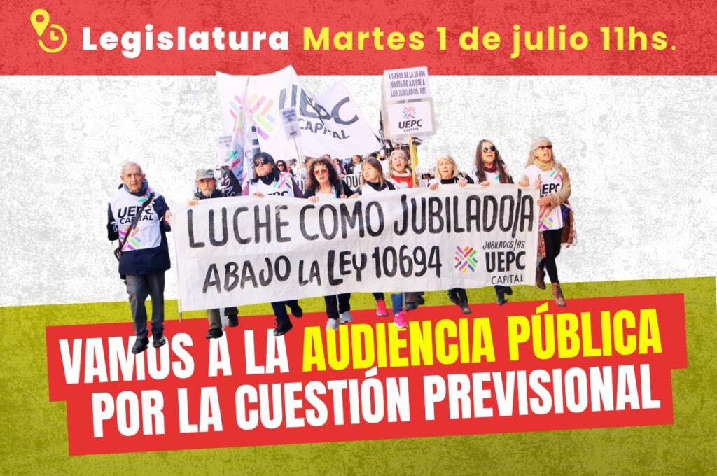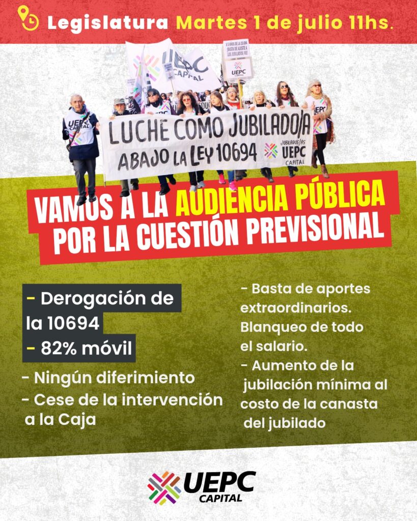 La misma fue convocada a instancias de una solicitud elevada a los bloques de la legislatura por parte de la Delegación Capital de UEPC junto a agrupaciones de trabajadores jubilados y activos de la provincia luego de una movilización que realizamos el pasado 20 de mayo en ocasión del quinto aniversario de la sanción de la Ley 10694, que rechazamos abierta y sistemáticamente, ped confirmandose la fecha del 1 de julio para la realización de la audiencia. Por tanto, se trata de otra instancia de lucha para poner de relieve los reclamos previsionales de los trabajadores de la provincia en el seno del poder político, que implementa las reformas que recortan los derechos y destruyen el 82% móvil.