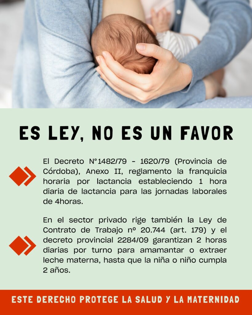 La Constitución Provincial, en sus artículos 23 y 24, es clara: garantiza el derecho a condiciones laborales que permitan el cumplimiento de la función familiar, especialmente en casos de maternidad. En esa misma línea, la Ley Nacional 26.873 promueve la lactancia materna y reconoce el derecho de las trabajadoras a contar con descansos diarios remunerados para amamantar. A nivel local, la Ley Provincial 9905 amplía estos derechos y extiende la licencia por maternidad a 180 días.
