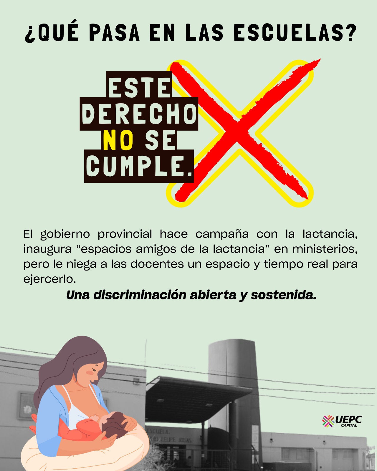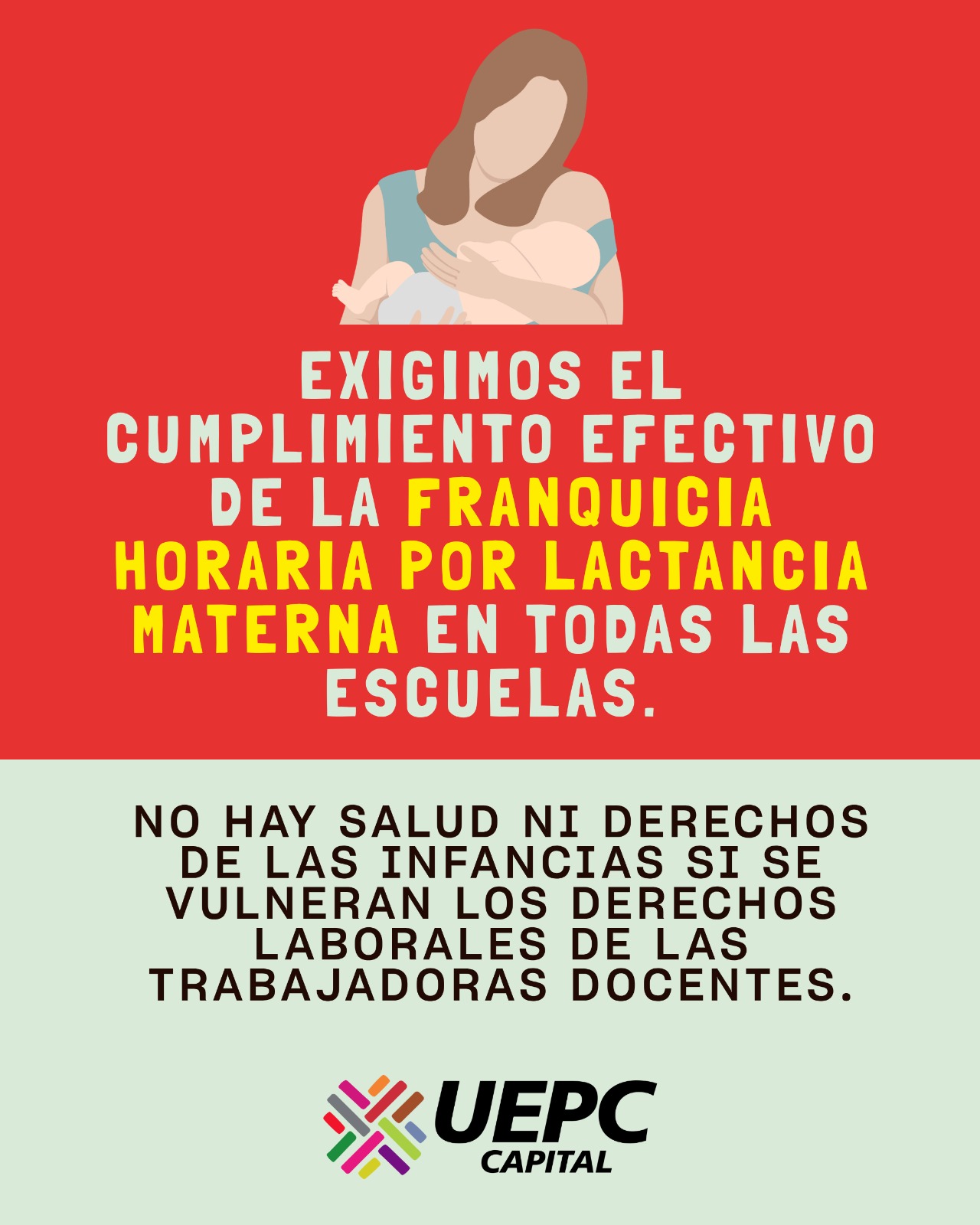 Desde UEPC Capital advertimos que esta situación afecta directamente a las docentes madres, colocándolas en un estado de desprotección y desamparo. Las decisiones arbitrarias y sin fundamentos vulneran lo establecido en el Estatuto del Personal de la Administración Pública Provincial, las leyes nacionales y provinciales que garantizan la protección de la maternidad, y los principios constitucionales que reconocen el interés superior del niño.