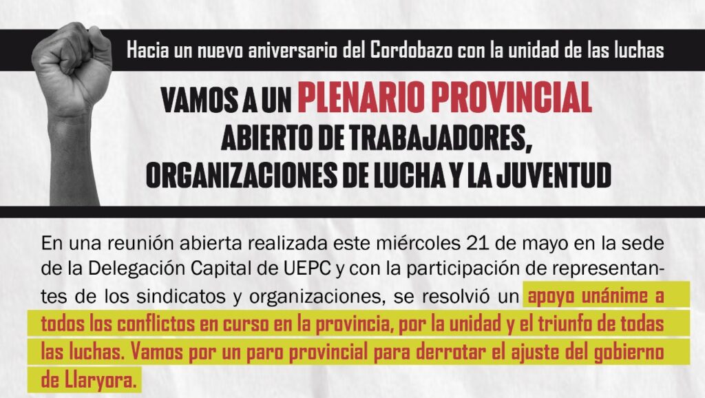 En una reunión abierta realizada este miércoles 21 de mayo en la sede de la Delegación Capital de UEPC y con la participación de representantes de los sindicatos y organizaciones UEPC Capital, Químicos y Petroquímicos de Río Tercero, ATE Río Tercero, CISPREN (Prensa), SUTNA, Junta Interna de ATE CONICET, miembros de la minoría de ADIUC (lista Roja y Negra), UTS (Unión de Trabajadores de Salud), agrupación Judiciales Alternativa 16N, delegados y delegadas del Hospital Rawson, de UOM, de SUOEM, de ATE No Docentes UNC, agrupación 15 de Marzo oposición del SEP, trabajadores activistas de Luz y Fuerza, agrupaciones de Jubilados y Jubiladas, jubilados autoconvocados, el Polo Obrero, MST-Teresa Vive, A Luchar, Movimiento de Agrupaciones Clasistas (MAC), Corriente Sindical 18 de Diciembre, ANCLA (Corriente Nacional Clasista Antiburocrática), el Foro Solidario Córdoba, integrantes de la Asamblea Ni Una Menos, estudiantes de la UNC y organizaciones políticas (PO, IS, PTS, MST, Nuevo MAS, COR), se resolvió un apoyo unánime a todos los conflictos en curso en la provincia, por la unidad y el triunfo de todas las luchas. Vamos por un paro provincial para derrotar el ajuste del gobierno de Llaryora.