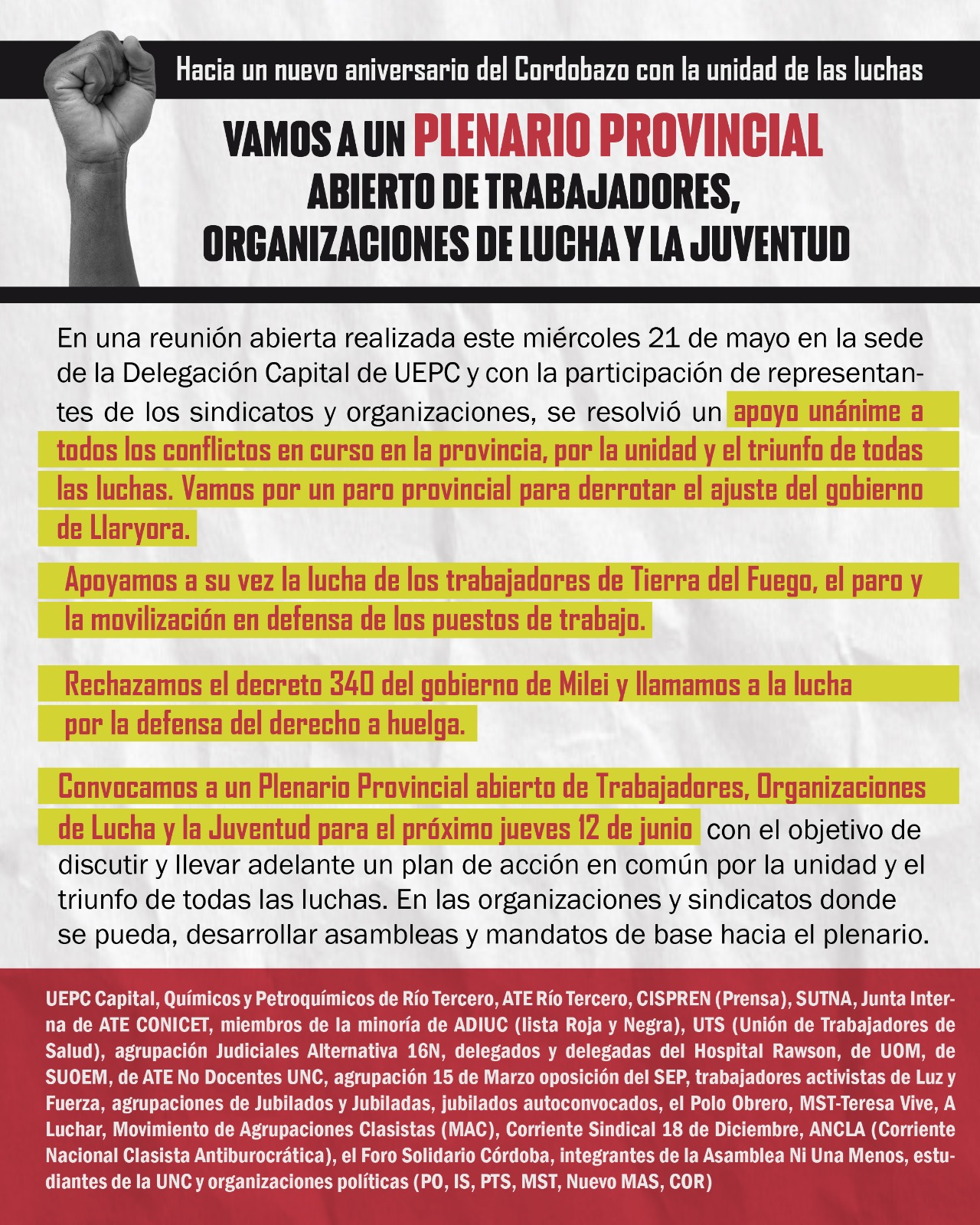 Convocamos a un Plenario Provincial abierto de Trabajadores, Organizaciones de Lucha y la Juventud para el próximo jueves 12 de junio con el objetivo de discutir y llevar adelante un plan de acción en común por la unidad y el triunfo de todas las luchas. En las organizaciones y sindicatos donde se pueda, desarrollar asambleas y mandatos de base hacia el plenario.