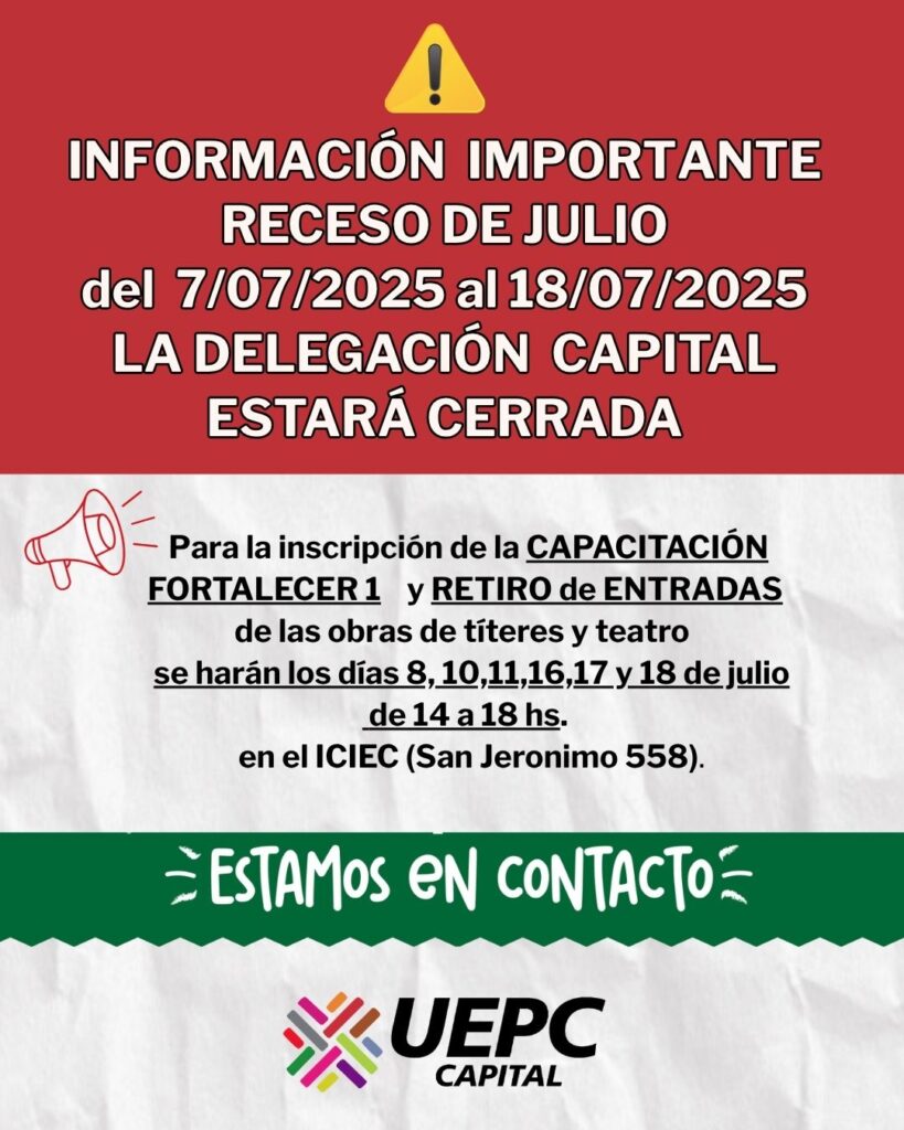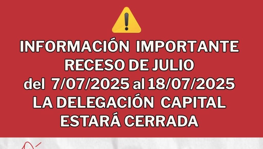 Informamos que del 7 al 18 de julio, durante el receso escolar, la sede de la Delegación Capital permanecerá cerrada.