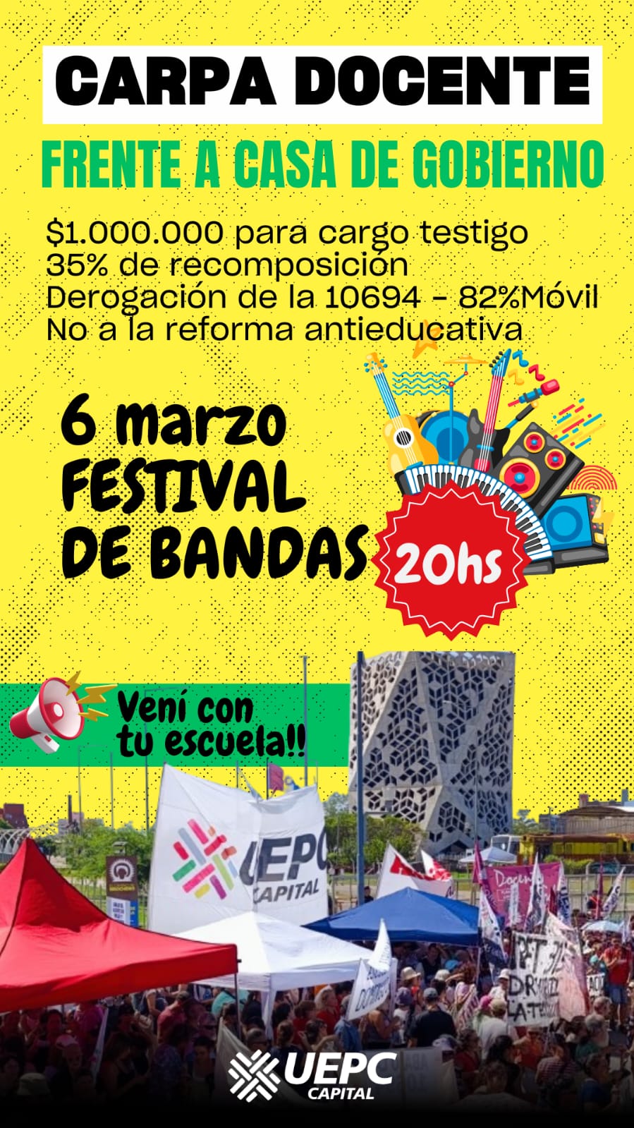 Esta tarde, a partir de las 20:00 hs, realizaremos un festival musical para acompañar la protesta. Además, convocamos a toda la docencia a sumarse a la carpa y participar de la conferencia de prensa mañana viernes a las 8:00hs, junto a delegadas y delegados, para informar sobre las próximas acciones y cómo continuará la lucha.