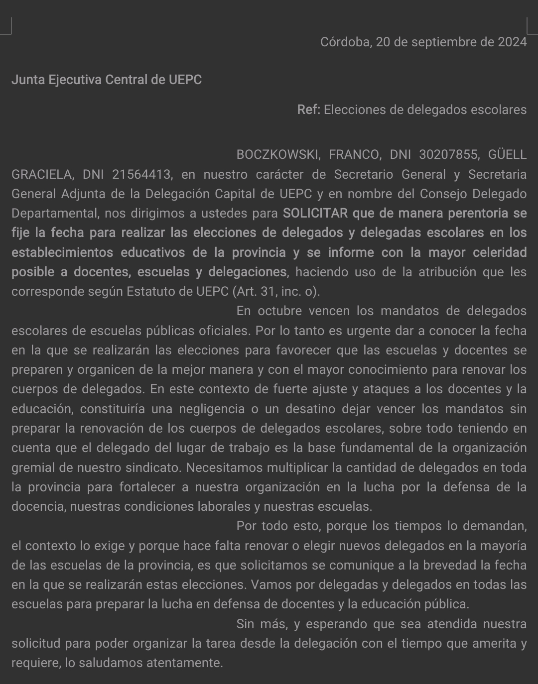 BOCZKOWSKI, FRANCO, DNI 30207855, GÜELL GRACIELA, DNI 21564413, en nuestro carácter de Secretario General y Secretaria General Adjunta de la Delegación Capital de UEPC y en nombre del Consejo Delegado Departamental, nos dirigimos a ustedes para SOLICITAR que de manera perentoria se fije la fecha para realizar las elecciones de delegados y delegadas escolares en los establecimientos educativos de la provincia y se informe con la mayor celeridad posible a docentes, escuelas y delegaciones, haciendo uso de la atribución que les corresponde según Estatuto de UEPC (Art. 31, inc. o).