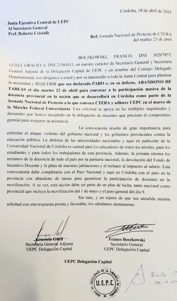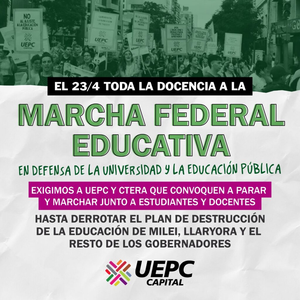 En el contexto de la próxima Marcha Federal Universitaria programada para el 23 de abril en Córdoba, la delegación de UEPC Capital ha solicitado a la Junta Ejecutiva Provincial la declaración de paro o, en su defecto, el abandono de tareas para ese día. La solicitud busca garantizar la participación masiva de la docencia en esta acción convocada por CTERA y adherida por UEPC como parte de la Jornada Nacional de Protesta.