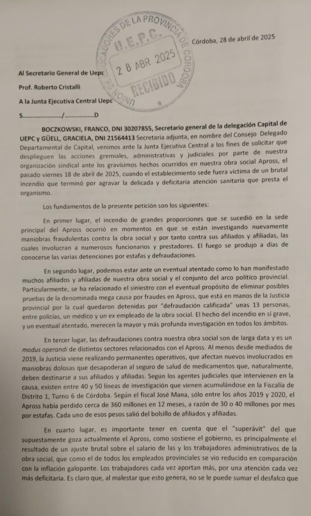 El Consejo de Delegados de UEPC Capital presentó este lunes 28 de abril un pedido formal a la Junta Ejecutiva Central del sindicato, solicitando la conformación de una comisión especial e independiente del gobierno y los prestadores que investigue el incendio ocurrido en la sede de Apross y las maniobras de vaciamiento que afectan a la obra social de todos los empleados públicos de Córdoba.