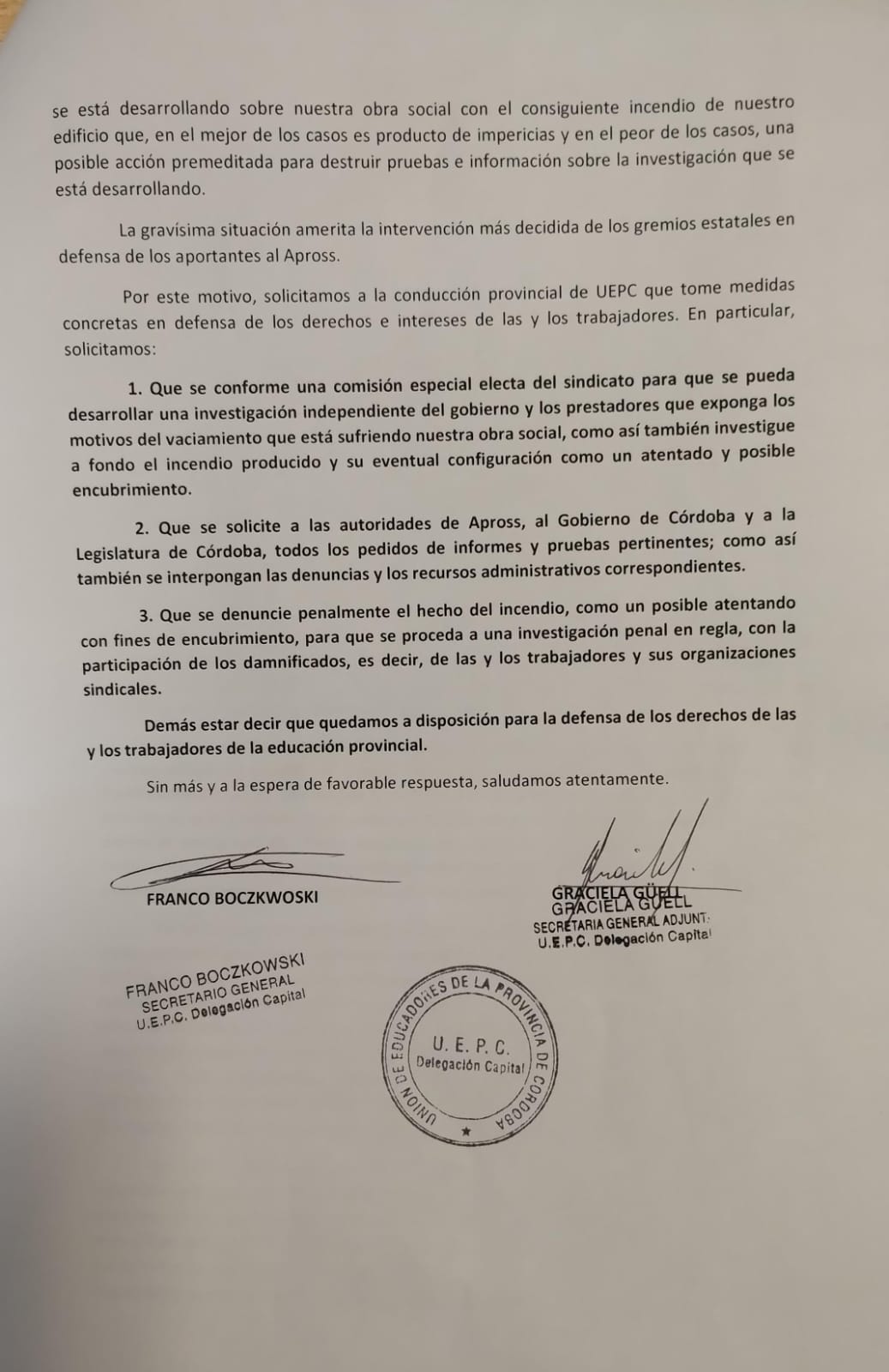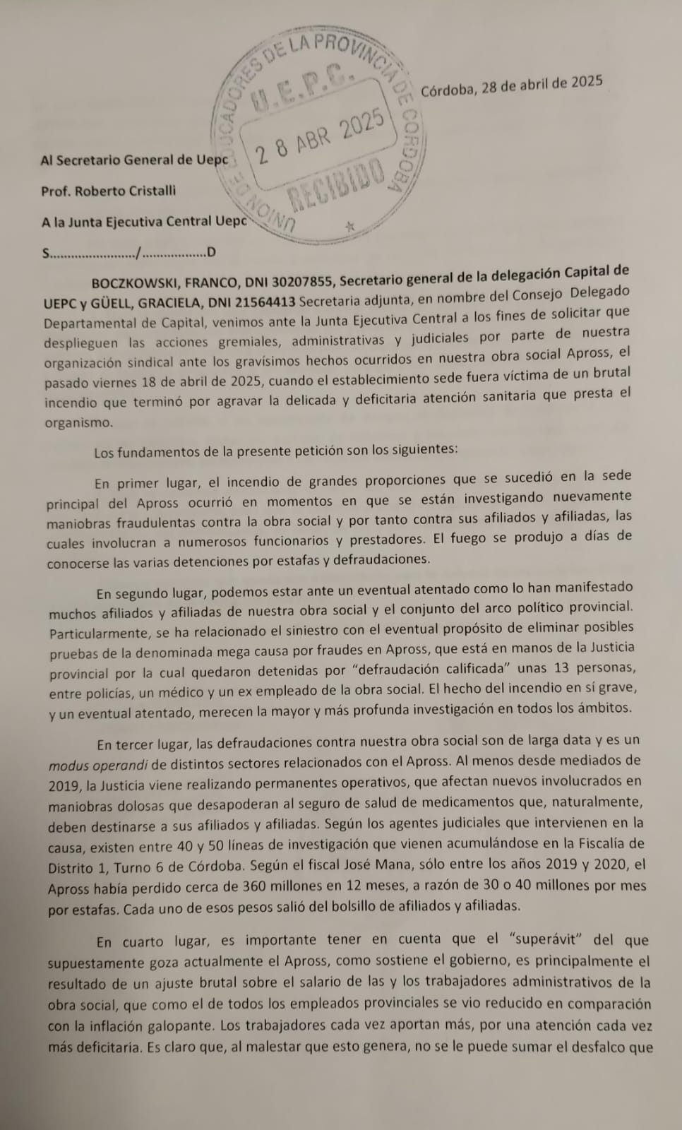 El escrito, firmado por Franco Boczkowski, secretario general de UEPC Capital, y Graciela Güell, secretaria adjunta, reclama que el sindicato impulse acciones gremiales, administrativas y judiciales frente a la gravísima situación que atraviesa Apross, agravada por el incendio registrado el pasado 18 de abril, en el contexto de nuevas investigaciones judiciales por estafas y defraudaciones.