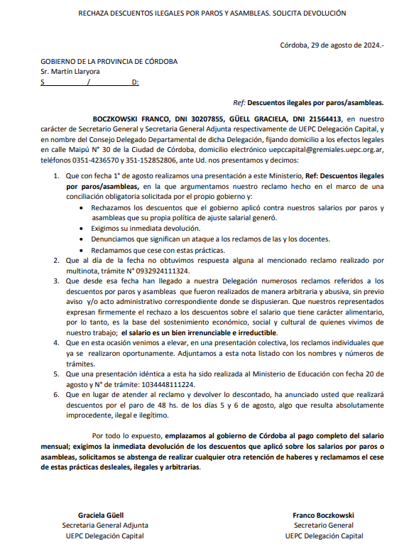 UEPC capital siempre en defensa de los y las trabajadoras de la educación, intimó al gobierno de Llaryora a devolver los descuentos aplicados de manera totalmente ilegal.