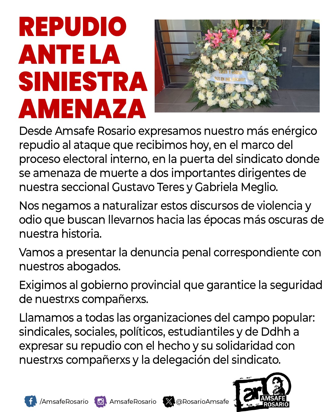 Exigimos la investigación y esclarecimiento de este hecho que nos remite a las peores épocas de nuestra historia, responsabilizamos al gobierno de Pullaro por su integridad y nos solidarizamos con todas y todos las y los compañeros de AMSAFE Rosario