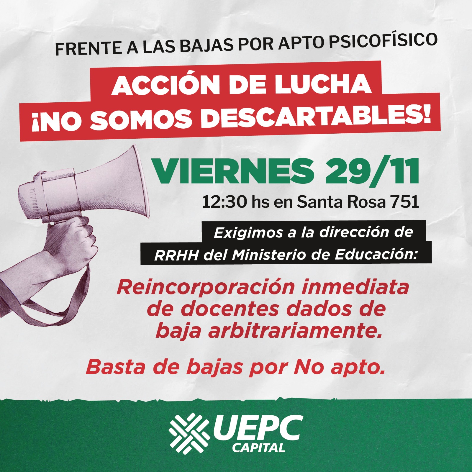 La Delegación Capital de UEPC denuncia que el Ministerio de Educación despide a docentes, incluso a quienes ejercen hace años. Utiliza el examen de aptitud psicofísica como excusa para estos despidos, cuando estos exámenes deberían ser previos al ingreso y por absoluta responsabilidad del empleador, se realizan meses e incluso muchos años después de que las personas están trabajando como docentes. En muchos de estos casos las y los docentes estaban sanos y por error de la Direccion de Salud en el Trabajo no se les dio el apto, en otros casos presentaban enfermedades laborales que el Ministerio se negó a reconocer otorgando la baja, algo inédito en el país.